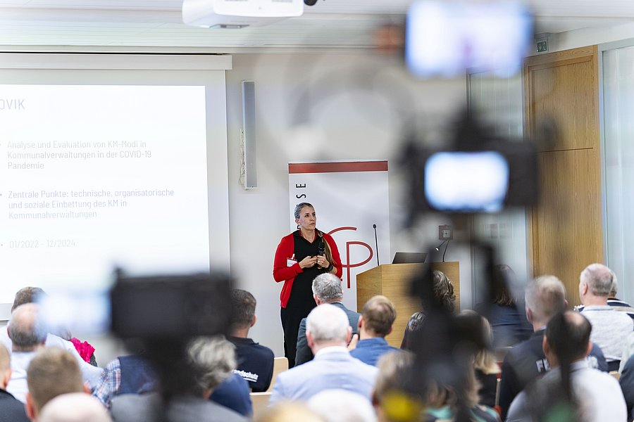 Abschließend stellte Dr. Patricia M. Schütte ihre Forschungsgruppe „Management und Organisation in der Gefahrenabwehr“ vor und präsentierte im Anschluss das von der Deutschen Forschungsgemeinschaft (DFG) finanzierte Forschungsprojekt zu „Kommunalverwaltungen im Krisenmodus“.